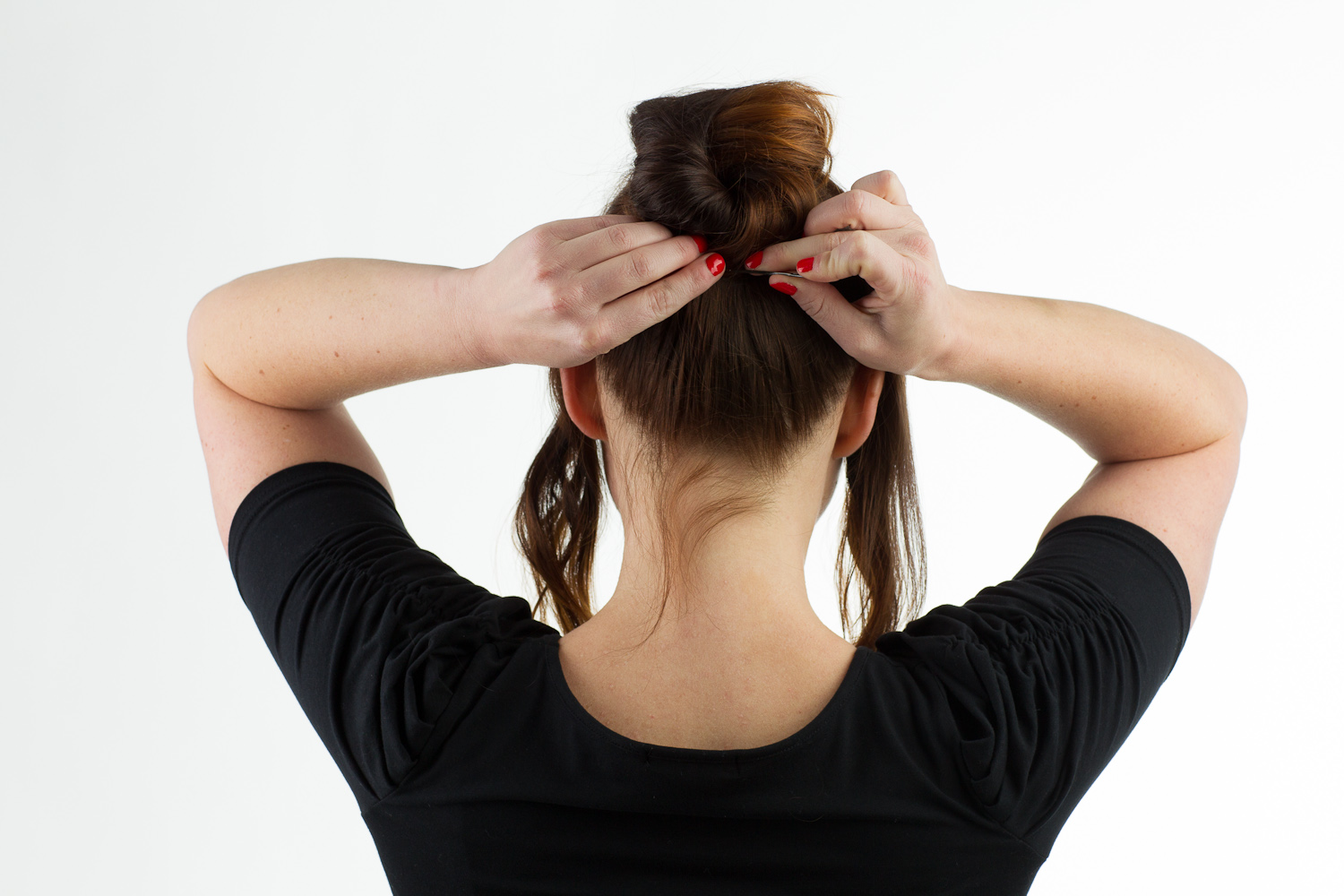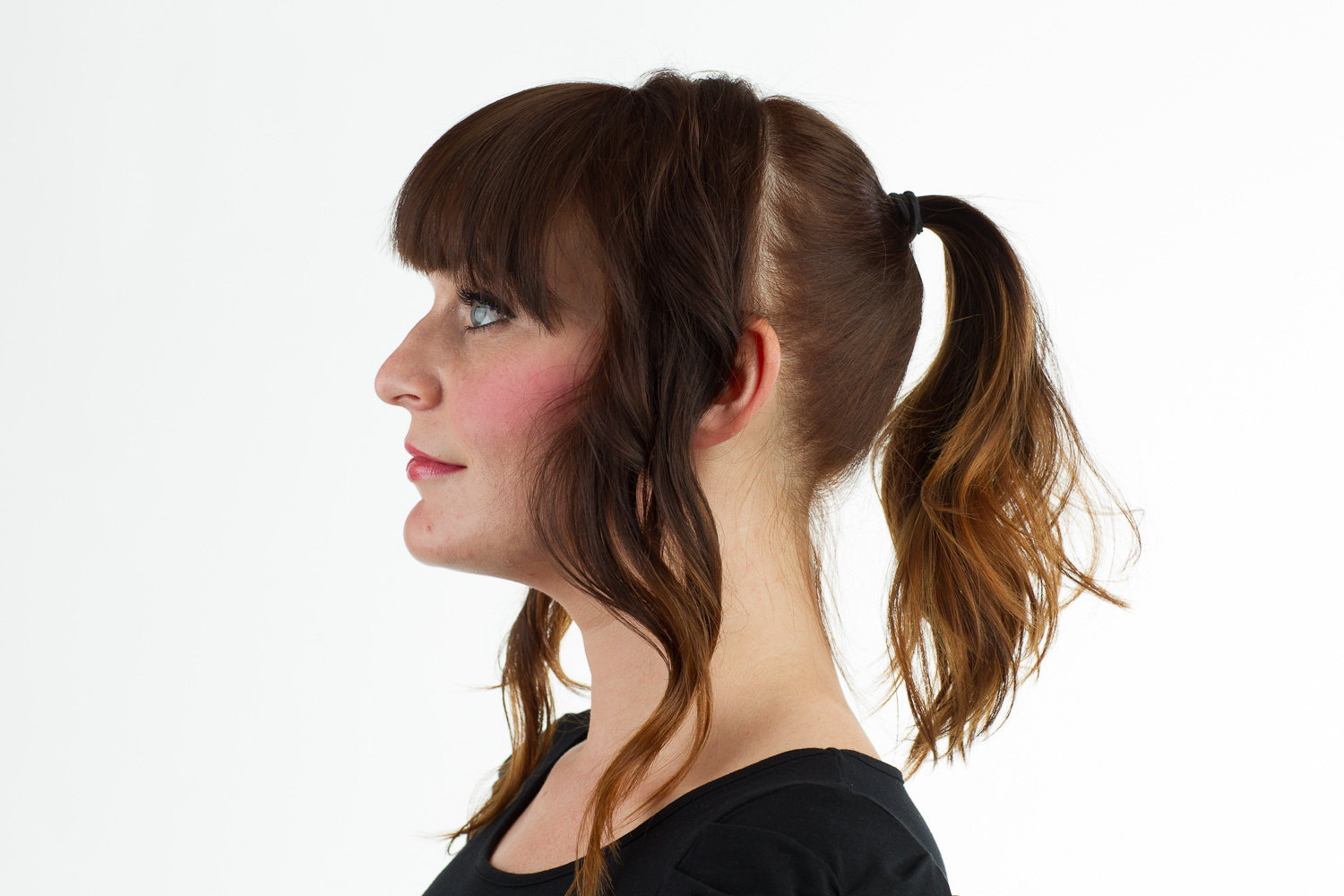 Part hair from ear to ear. Put the back hair in a ponytail.