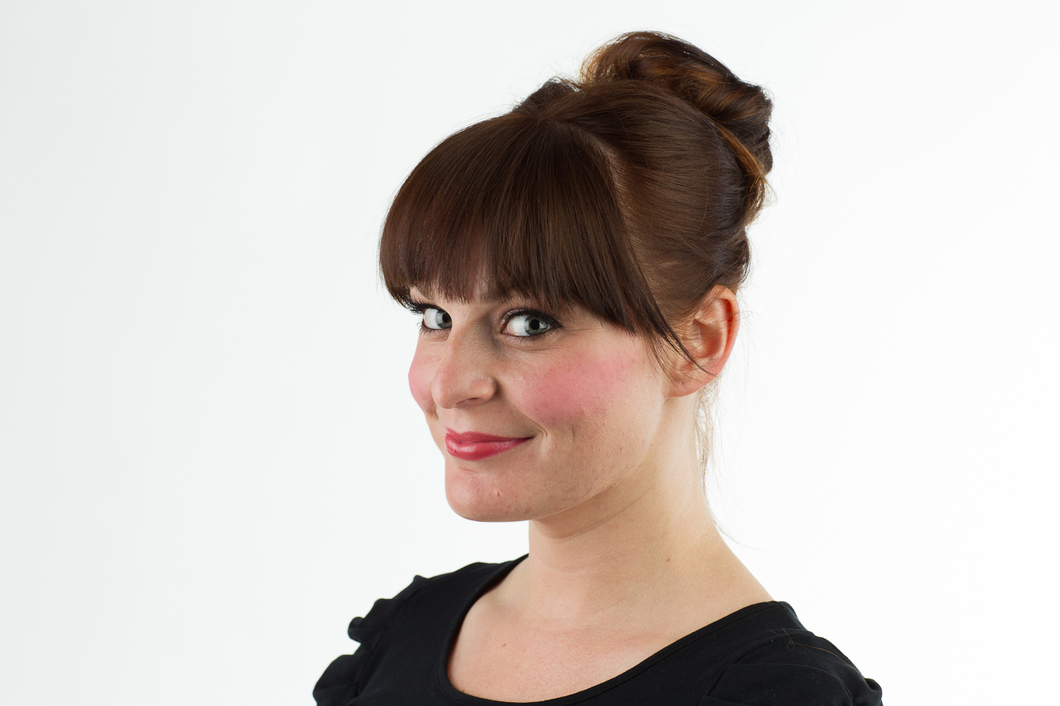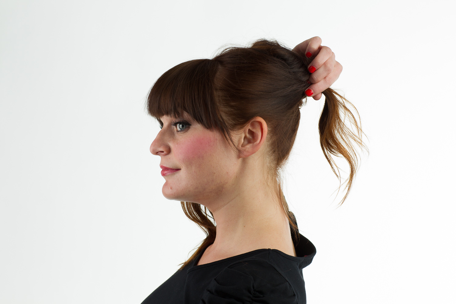 Part hair from ear to ear. Put the back hair in a ponytail.